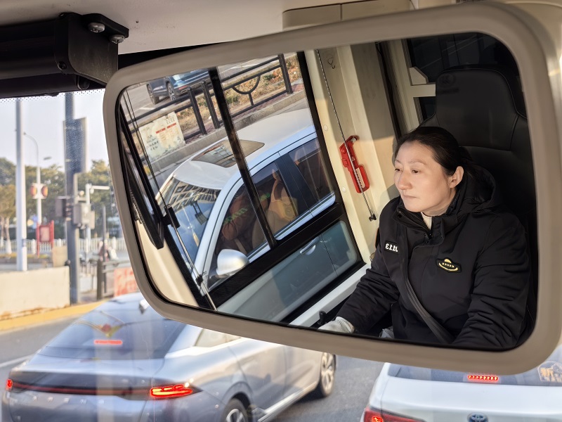 “鹽阜人民商場(chǎng)站到了,有下車(chē)的乘客,請(qǐng)帶好自己的隨身物品……”規(guī)范進(jìn)站后,車(chē)輛再次平穩(wěn)啟動(dòng),透過(guò)駕駛室望去,倪敏仔細(xì)觀察著前方路況,熟練操控著手中的方向盤(pán),穿梭于城市的大街小巷!拔议_(kāi)車(chē)有5個(gè)堅(jiān)持,堅(jiān)持車(chē)停穩(wěn)開(kāi)門(mén)、關(guān)好門(mén)起步,堅(jiān)持笑臉相迎、有問(wèn)必答,堅(jiān)持平穩(wěn)起步、均勻前行,堅(jiān)持遵章守法、文明行車(chē),堅(jiān)持不斷學(xué)習(xí)、提升自己!痹谔焐铰方ㄜ娐房诘群蚣t綠燈時(shí),她笑著說(shuō)。