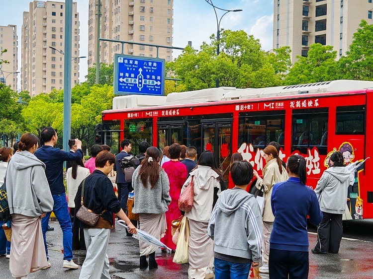 接親途中,新人與親友們在車廂內(nèi)唱歌、互動,沿途風(fēng)景與歡聲笑語交織,將接親路線變?yōu)椤靶腋S^光之旅”。新娘十一表示:“選擇公交婚車能讓外地親友共同參與接親,這份獨特的熱鬧與溫情,既有意義又讓人難忘!”