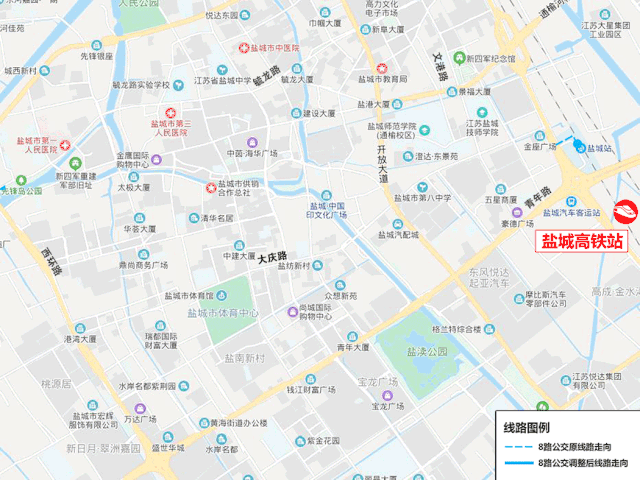 線路走向:西環(huán)路、東進路、解放路、青年路、鹽城高鐵站