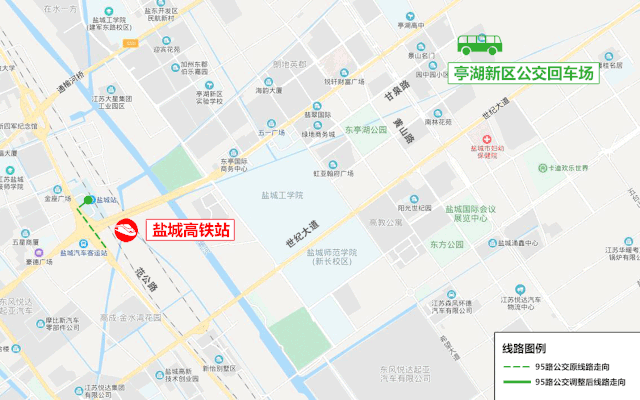 線路走向:高新區(qū)公交樞紐、振興路、鹽瀆路、新204國道、新都路、良友路、鹽瀆路、新園路、世紀大道、范公路、鹽城高鐵站