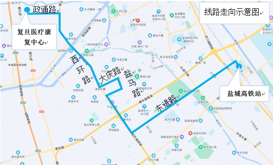 線(xiàn)路走向:鹽城高鐵站、東進(jìn)路、西環(huán)路、騰飛路、鹽馬路、大慶路、西環(huán)路、政通路、鹽城復(fù)興醫(yī)院。