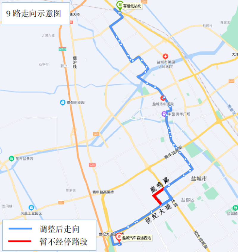 暫不停靠站點(diǎn):鹿鳴路西環(huán)路口、鹿鳴路鎮(zhèn)中路口(東)、潘黃街道辦事處、潘黃鹽城農(nóng)商銀行。