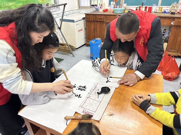“點(diǎn)如水滴由輕到重;橫似扁擔(dān)兩頭稍頓……”志愿者朱茂同師傅手把手地指導(dǎo)孩子們練習(xí)毛筆字,從坐姿、握筆、選貼教起,為孩子們講解毛筆書法的入門知識(shí)。