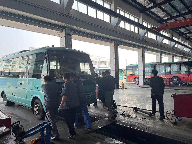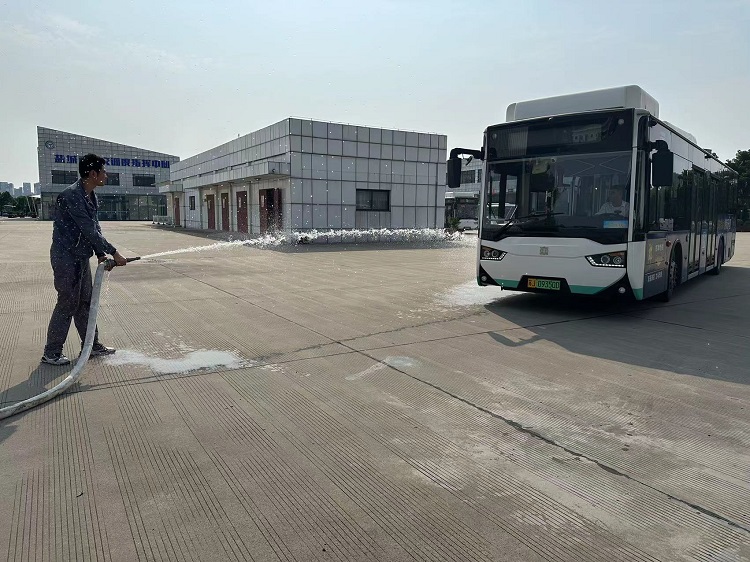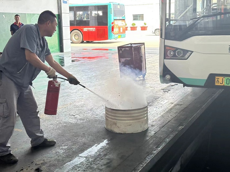 火情發(fā)生后,現(xiàn)場(chǎng)負(fù)責(zé)操作的修理工迅速取來就近的滅火器展開撲救,并大聲呼喊現(xiàn)場(chǎng)小修班長(zhǎng)協(xié)同滅火,同時(shí)向公司領(lǐng)導(dǎo)報(bào)告情況。公司領(lǐng)導(dǎo)立即趕到現(xiàn)場(chǎng),指揮駕駛員將車開到空曠、開闊且靠近消防栓的地方,整個(gè)演練過程有條不紊。